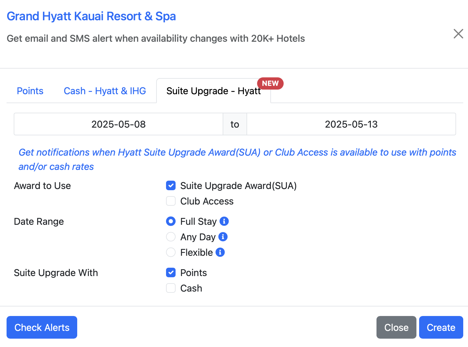 We love getting a suite upgrade at Hyatts, but they are sometimes unavailable. Rather than give up, we can set a suite upgrade alert and have a much better chance of redeeming that Suite Upgrade Award. I am looking for a suite upgrade at the Grand Hyatt Kauai Resort and Spa in the example below. I’m keeping my fingers crossed that it comes through!
