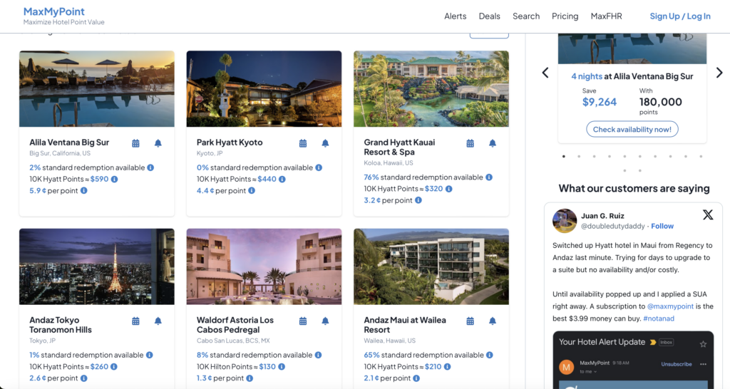 MaxMyPoint doesn’t cover every hotel program, but it does cover the four major ones: Hyatt, Marriott, IHG, and Hilton. We consistently look at these four the most often for hotel availability using points.