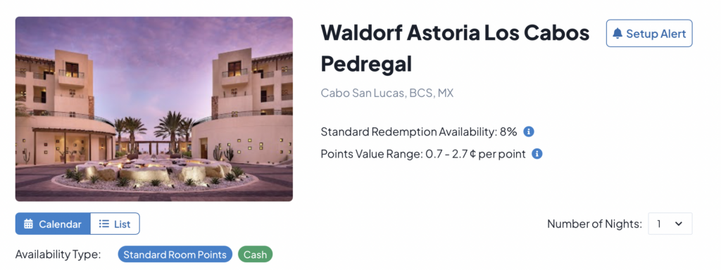Sometimes, though, it’s not that easy. Let’s say I also wanted to go to the Waldorf Astoria Los Cabos Pedregal in the winter. I hoped to go in February but I don’t find a date with standard award availability, so I click the “setup alert” button.