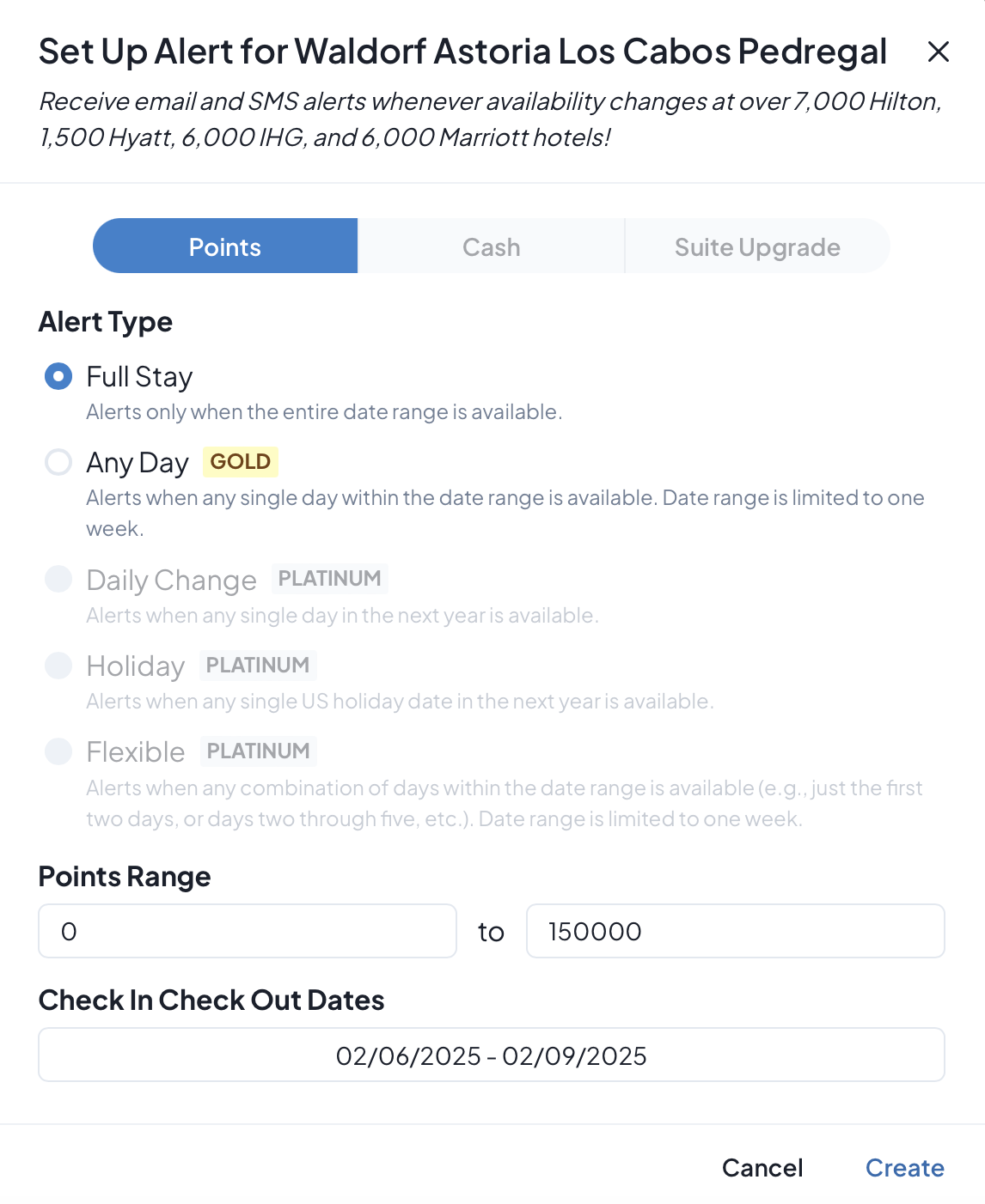 The following screen comes up, and I fill in my dates (full stay or any dates) and create the alert.