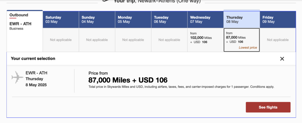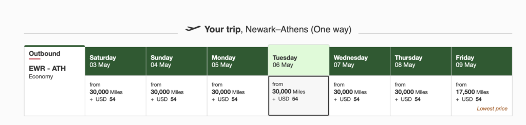 One of the best deals is one of the fifth-freedom flights. Here is an option for 87K miles on Emirates from New York City to Athens. With this flight, I would position to New York. Positioning flights are a great way to take advantage of good flight deals.