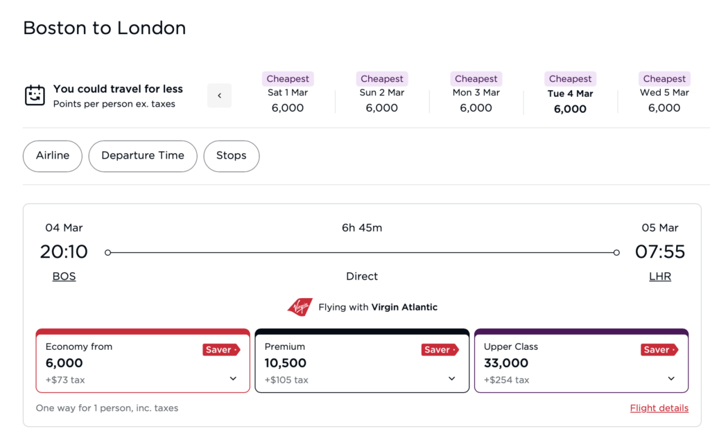 Virgin Atlantic is another great partner to use when transferring Ultimate Rewards® to book flights to Europe. Sometimes, transfer bonuses will make your points go further, which is always a win-win, and Virgin Atlantic has fairly frequent transfer bonuses you may want to take advantage of. Flying from the east coast to London can be particularly cheap. Just look at how cheap these flights are (even without a transfer bonus)!