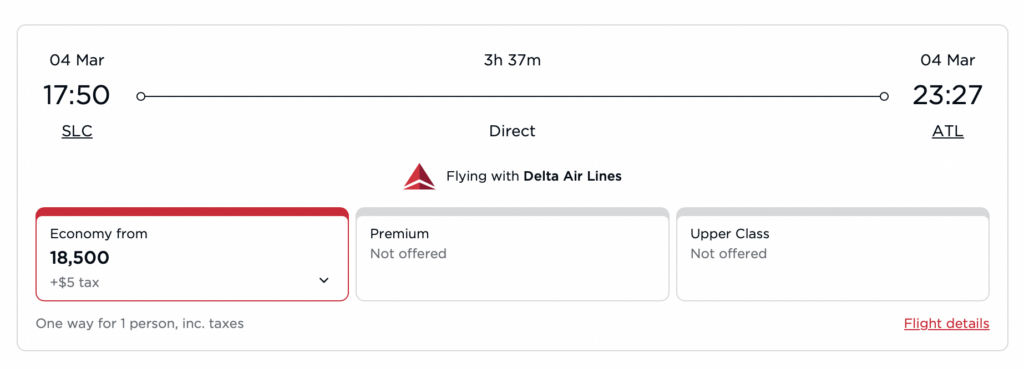 Let’s take two Delta hubs, Salt Lake City and Atlanta. When I look on Delta for a flight on March 4th, it costs 38,000 miles. The same flight booked on Virgin Atlantic is only 18,500 miles. Crazy, huh?