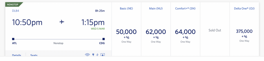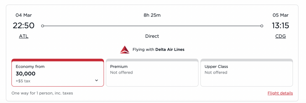 Okay, let’s check out a flight from Atlanta to Paris on a Delta flight in economy. It is a direct flight, and you’d expect the cost in miles to be fairly comparable, right? Look at these shocking results!