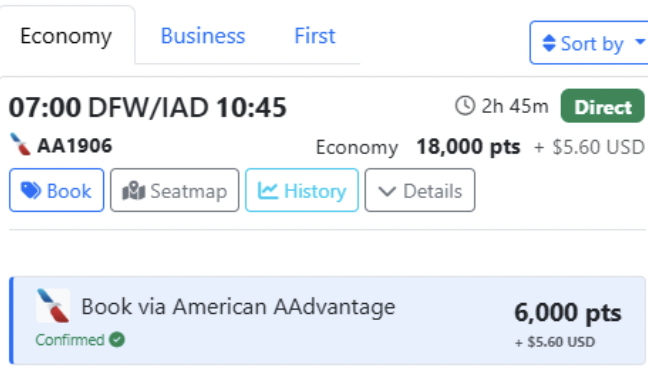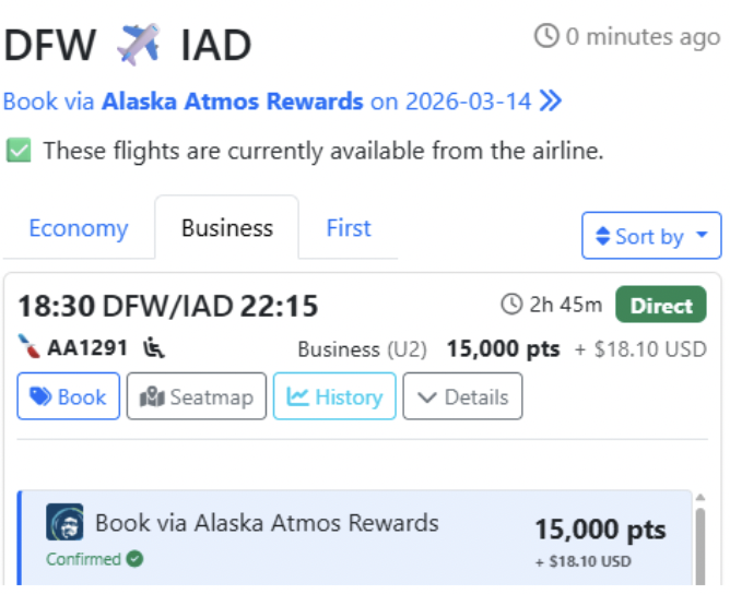 Option 1: Dallas (DFW) → Washington, D.C. (IAD)